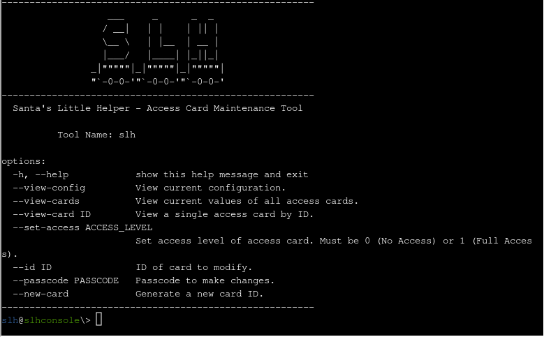 This will give us the command options for the SLH tool. It also tells us, as we should have guessed, that we’ll need a password before we can do anything. Completely by accident I pressed the up arrow and found that the bash history had not been cleared. Running history shows the following